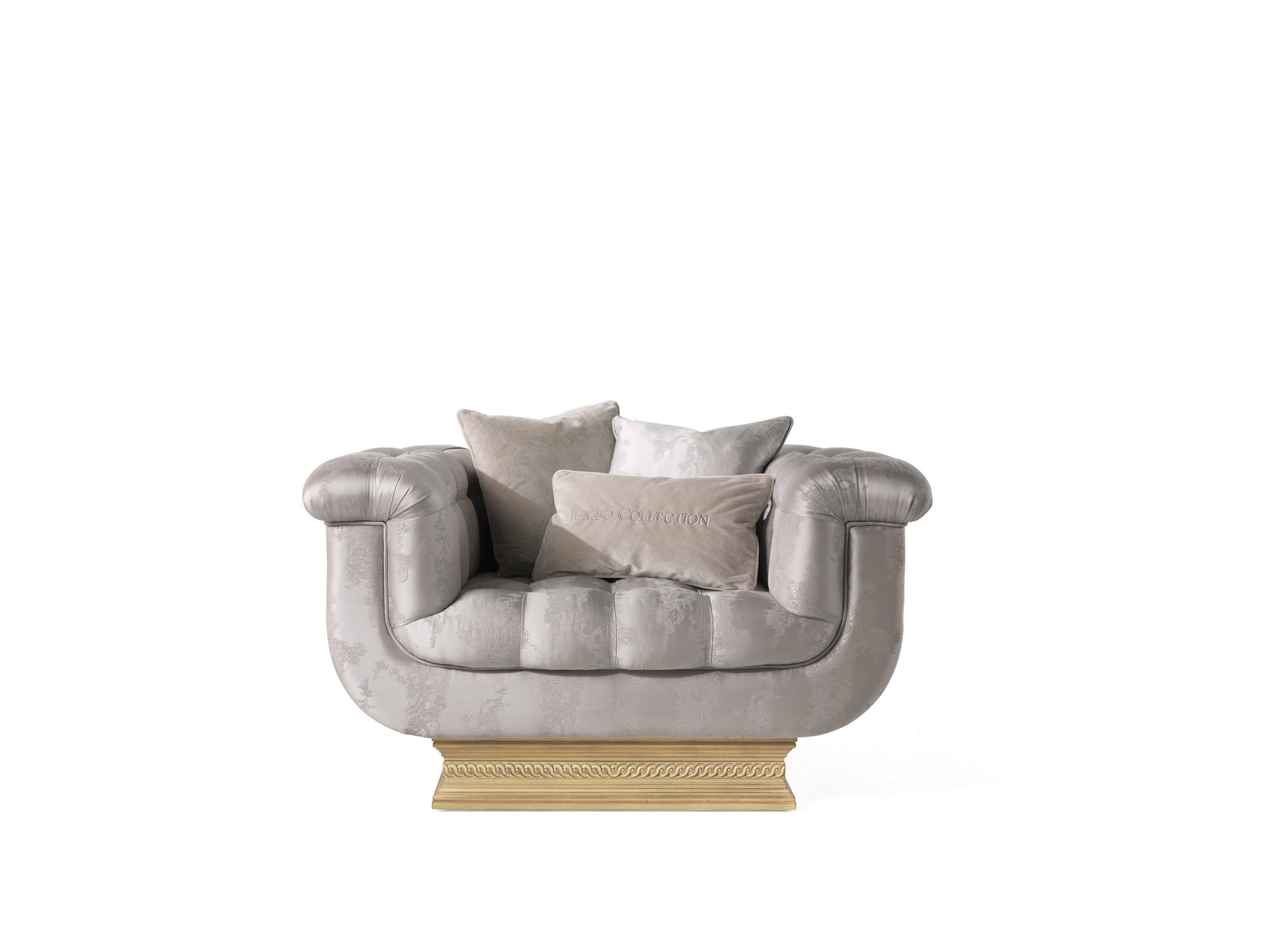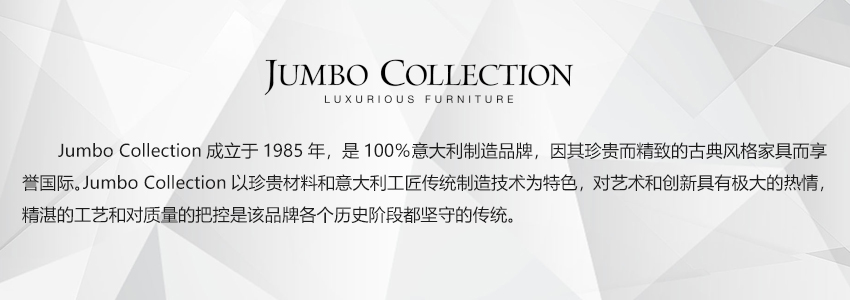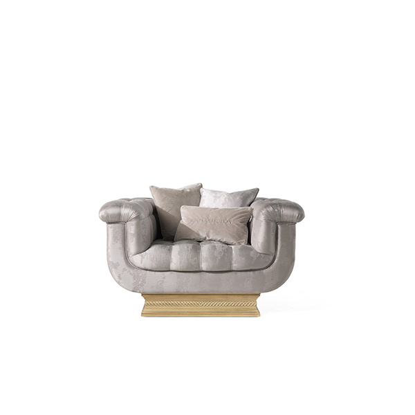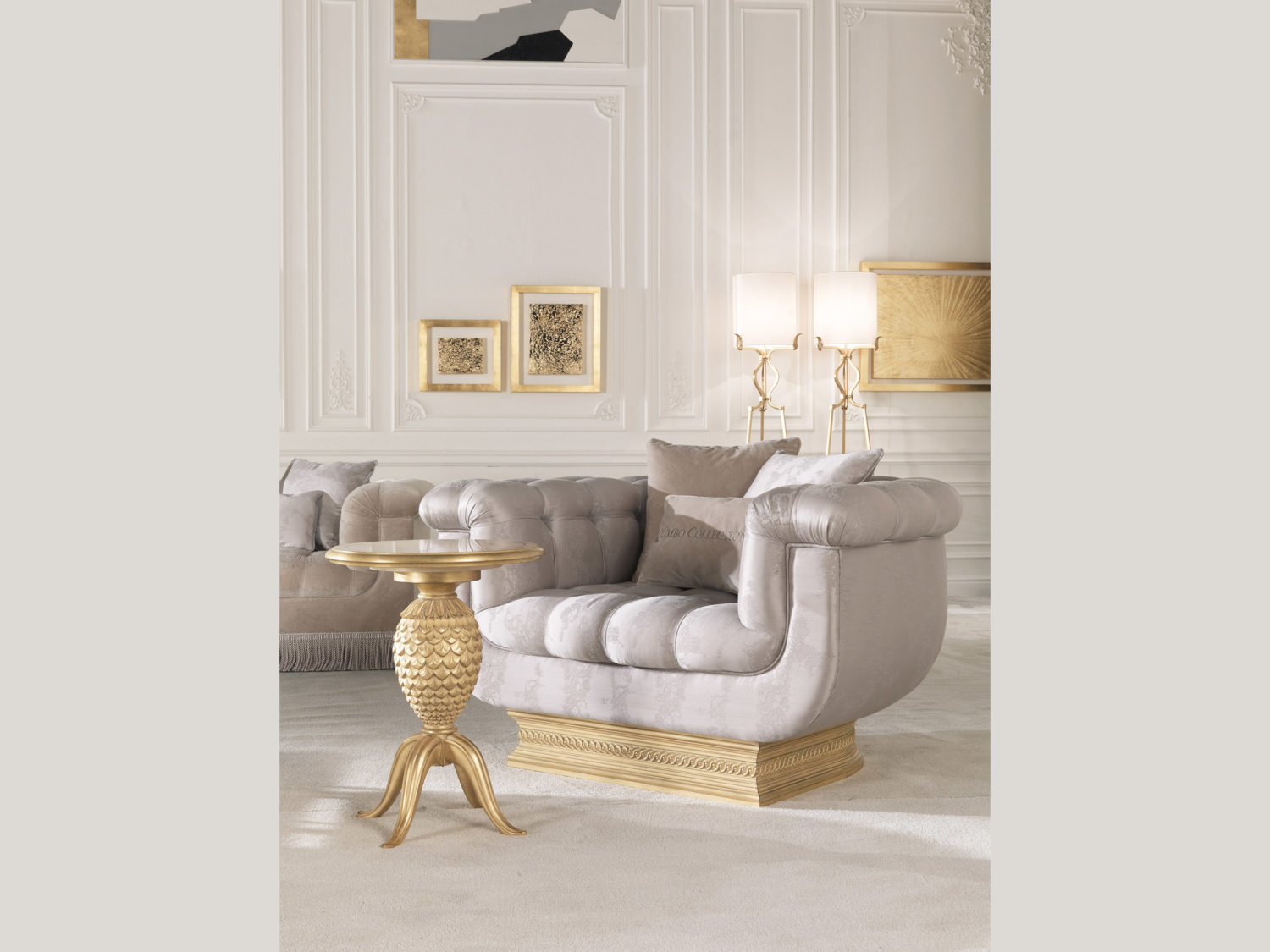 木质结构,座椅、靠背和扶手完全采用提花织物装饰。手工雕刻的木质底座,金箔饰面。