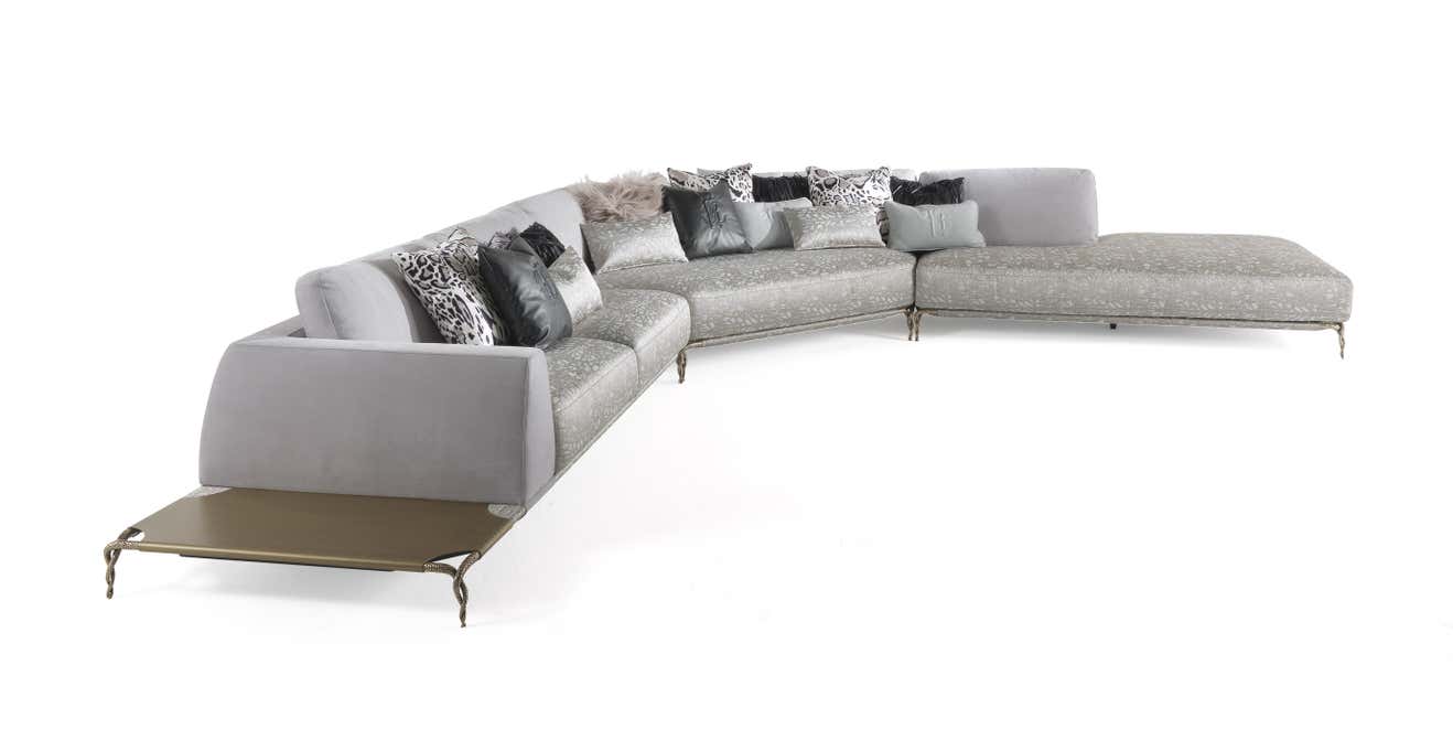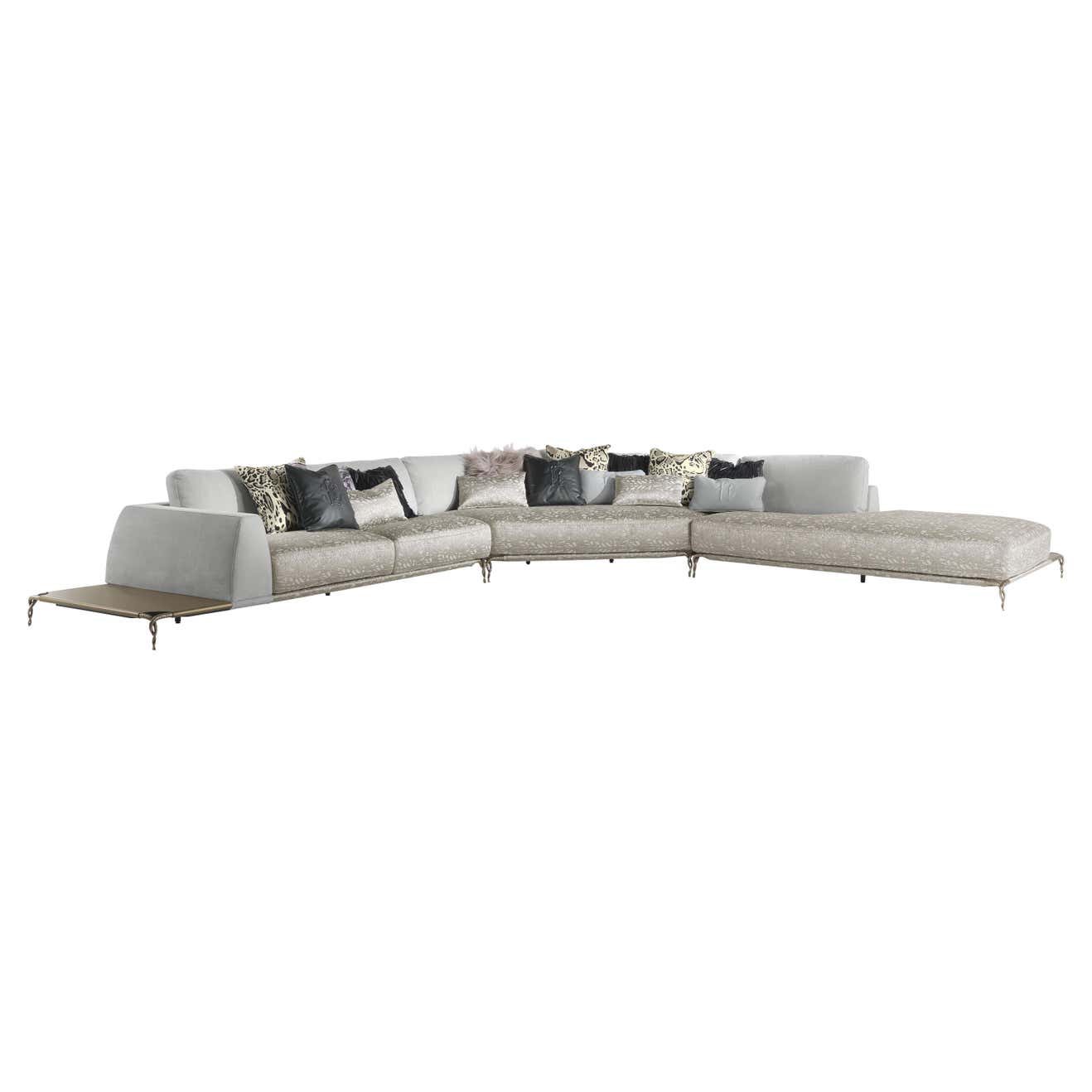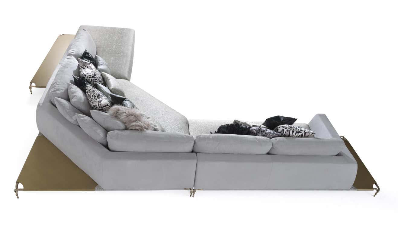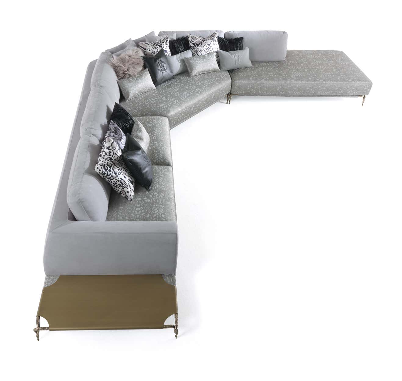 沙发和组合沙发系列,采用金属和多层木材结构。填充羽毛和泡沫。来自该系列的织物或皮革内饰。脚可采用铸黄铜涂层金饰面。金属拉丝青铜饰面的架子。