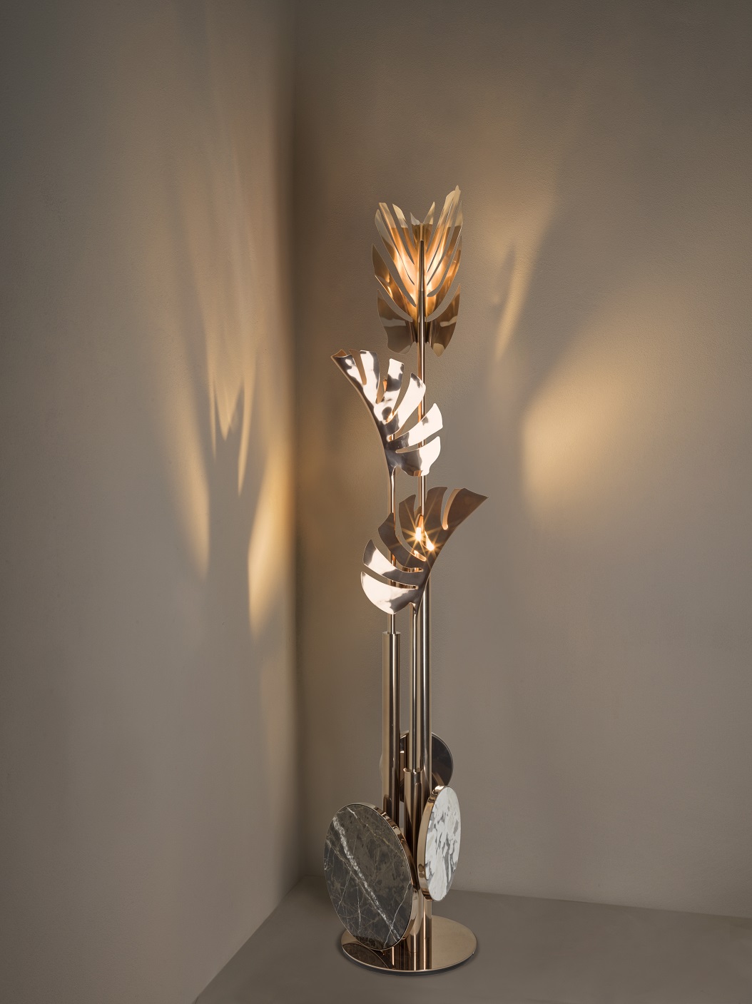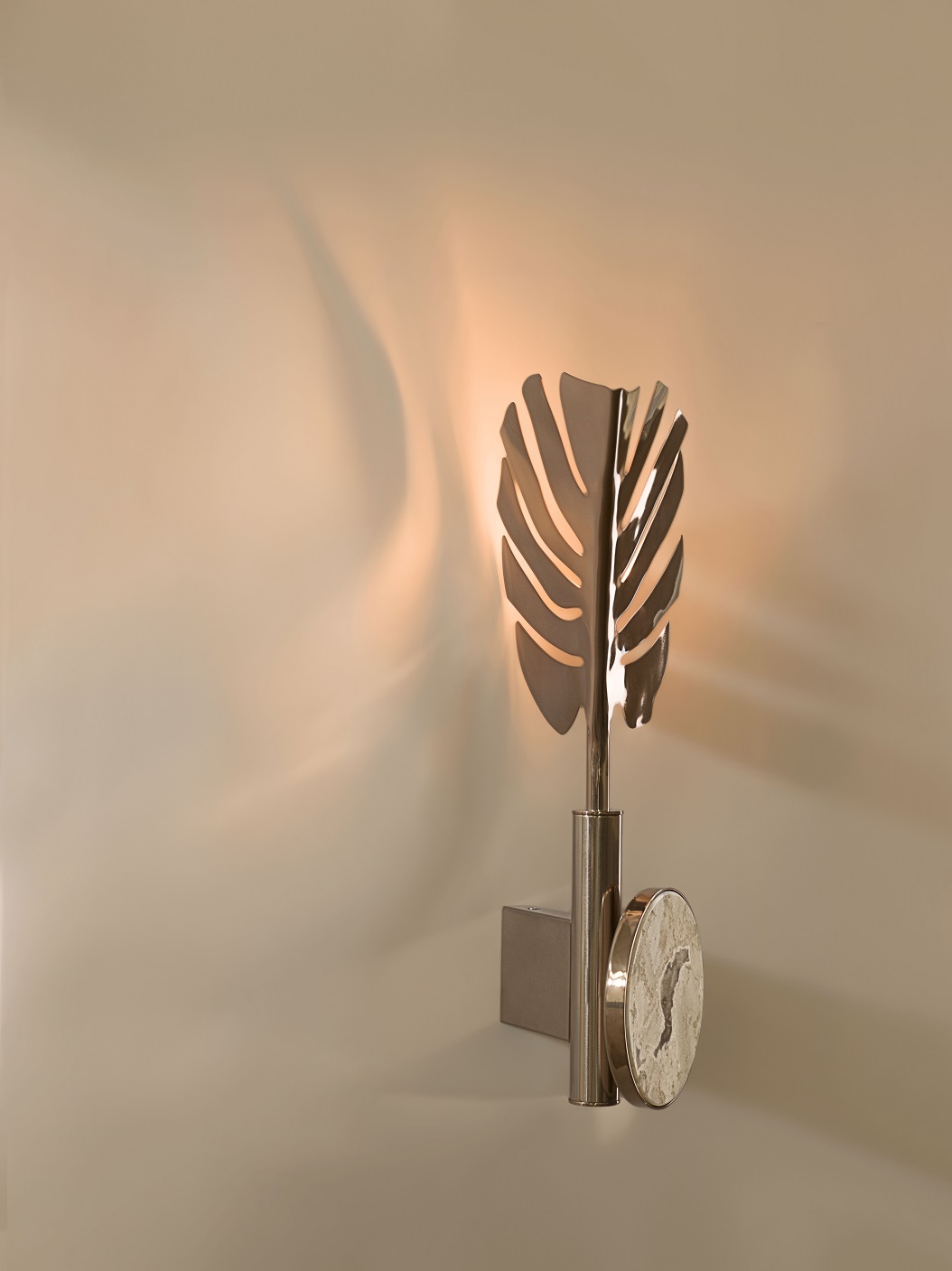 由大理石元素支撑的金属叶子,它们包含发光的花蕊,在墙上反射出它们的形状。