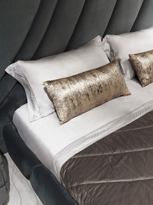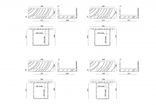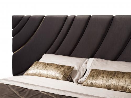 用皮革或织物装饰的床,床头板由杨木胶合板的结构和带子组成,一个接一个地填充和装饰,创造一个三维图案。可以安装在墙上。床架的结构为胶合板,并有绗缝装饰。床可以被拆开。抛光的不锈钢基座。木质板条由四个角落的支架和一个中央杆支撑,高度可以调节。金属部件可以选择金属饰面中的任何饰面。