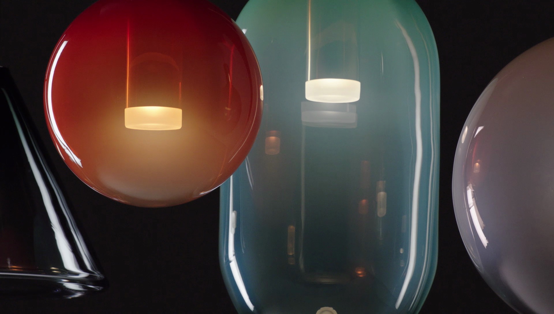这些引人入胜的尺寸的照明灯具被手工吹制成结合透明玻璃和有色玻璃的定制形式。