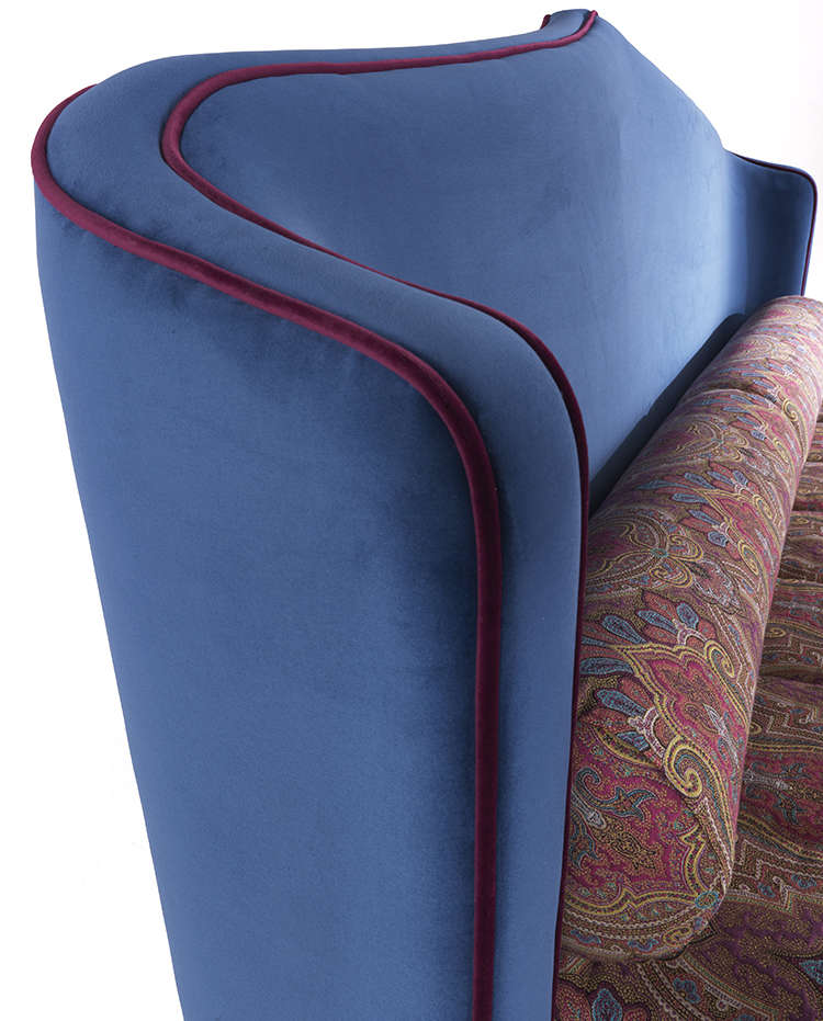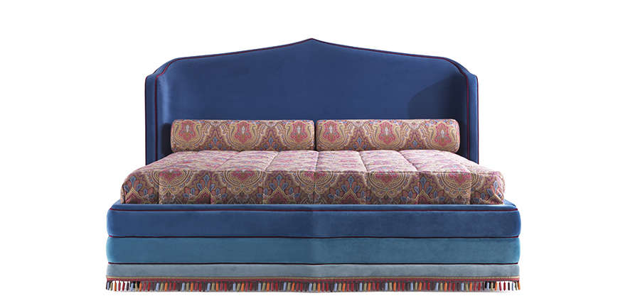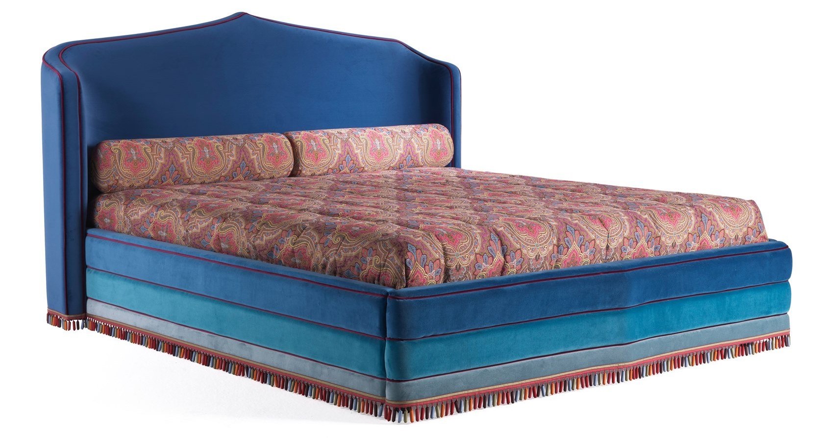 一张童话般的床,灵感来自“一千零一夜”的意象。床头板的蔓藤花纹形状、带有紫色滚边的强烈绿松石色以及珍贵的多色装饰品营造出一种神奇而精致的氛围。