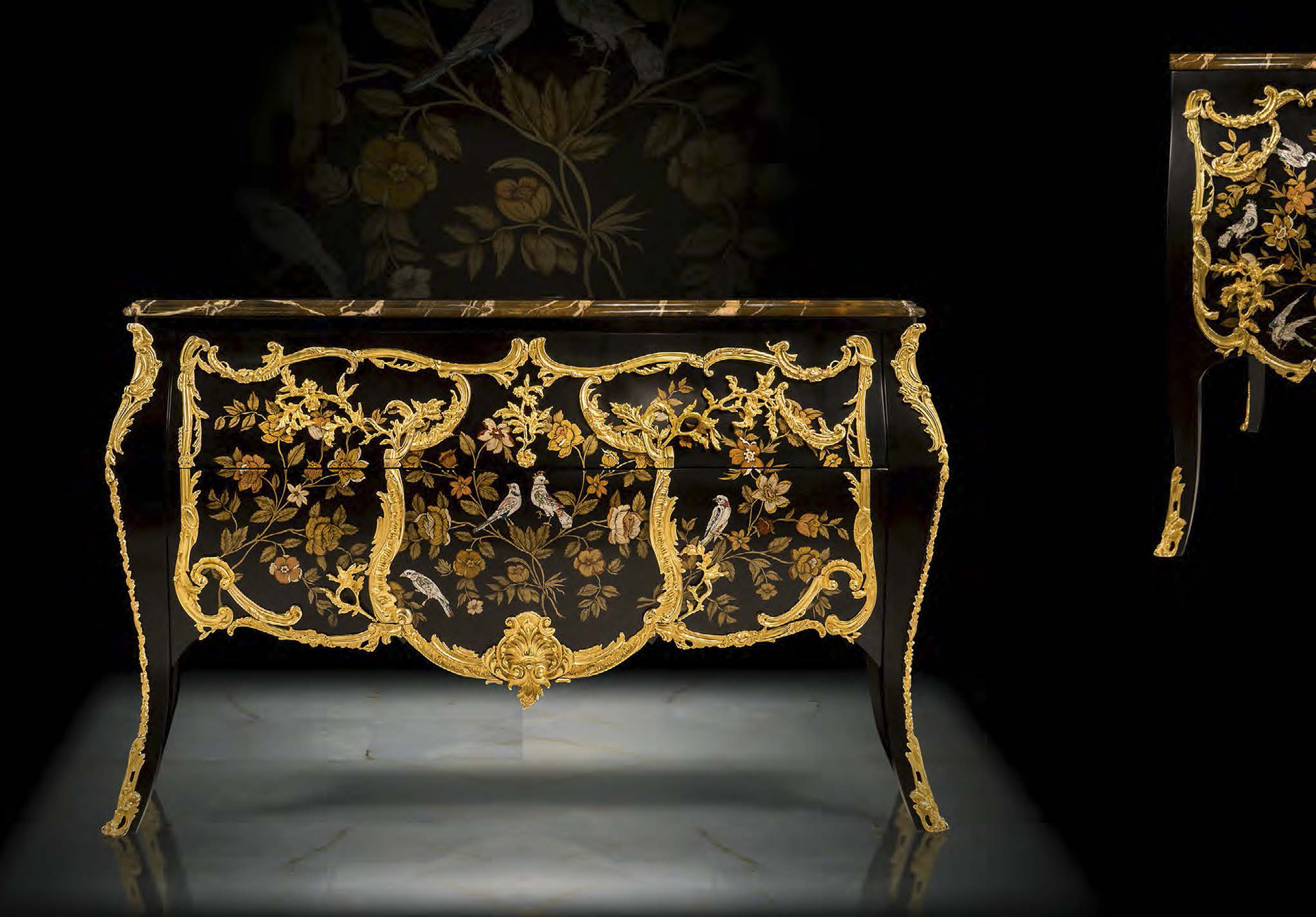 路易十五风格的抽屉柜,黑色胡桃木电镀,珍珠母镶嵌花环,花鸟图案。凿制和24kt镀金黄铜装饰。大理石顶。克里亚尔德·马蒂厄(法国(1689-1776))的科里。