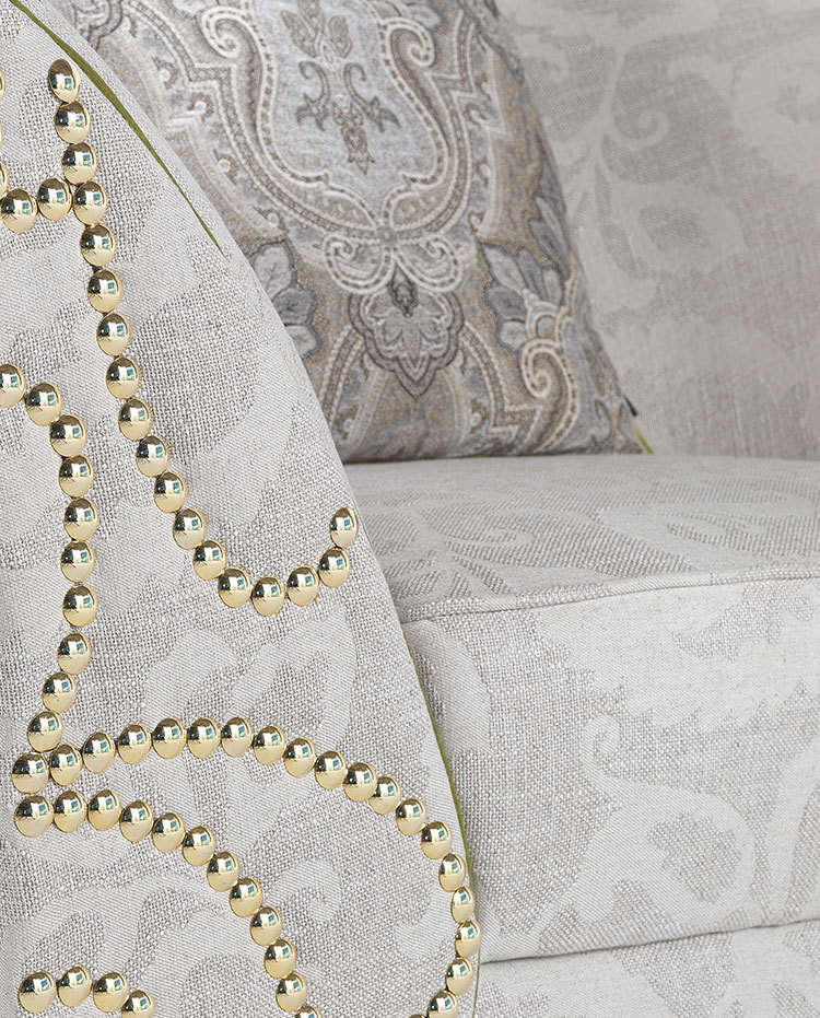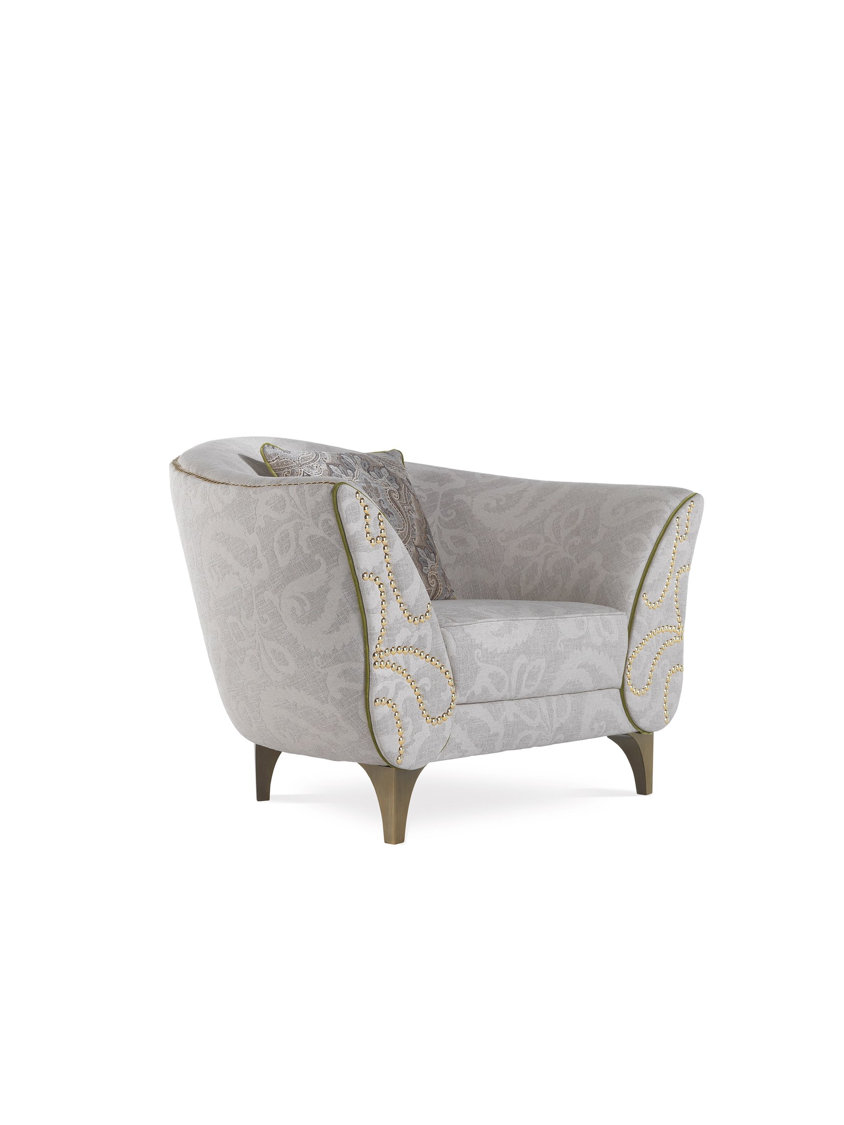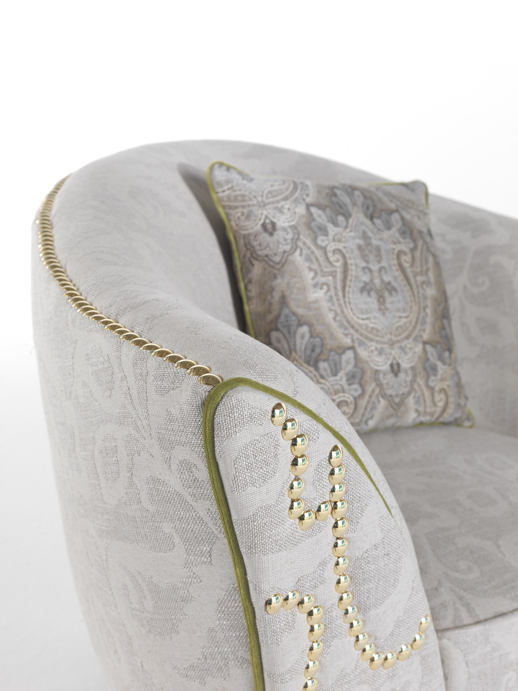 阿格拉(Agra)用聚氨酯泡沫填充的扶手椅,织物猫的内饰。B Greyton col。1 Ecru,天鹅绒猫的滚边。Venezia col。7酸性绿色和装饰性金色钉子。 液态金属漆木。